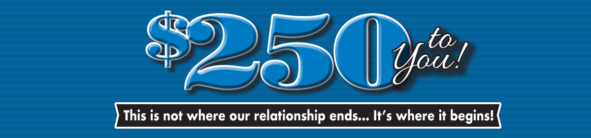 Along with the phenomenal benefits that you will receive with the recent purchase of your vehicle, we would also like to offer you $250 if a friend, neighbor or family member that you have referred to us and purchases a vehicle within 180 days of your original purchase! Use it for a spa day, shopping spree or however you choose!